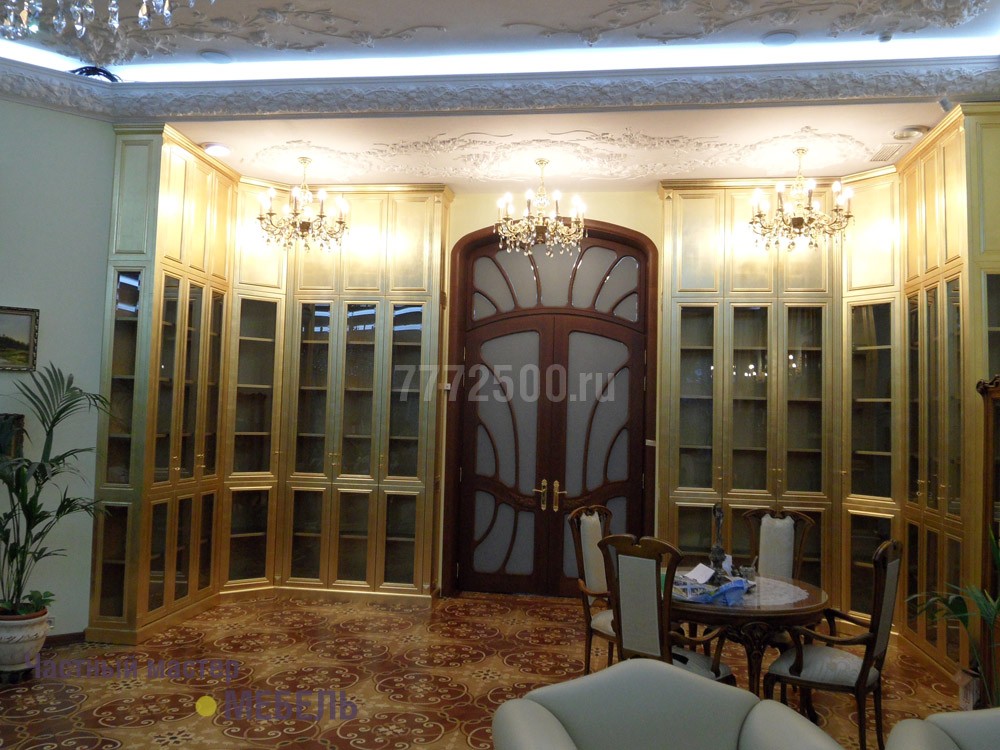 Хочется обратить внимание, что данная библиотека декорировалась без использования краски или эмали, а покрыта сусальным золотом. Работа по покрытию составляла почти 3 месяца.Все шкафы у этого заказчика выполнены из массива дуба в классическом стиле.