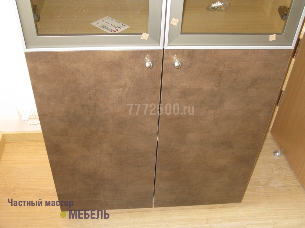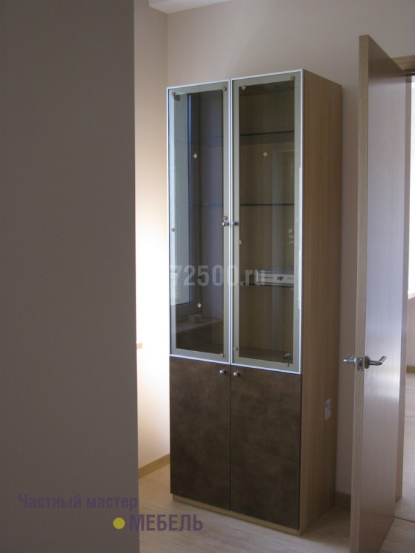 Книжный шкаф из ЛДСП «Egger» цвета Дуб Феррара Светлый. Фасады из глянцевых панелей «Алвик» и алюминиевого профиля со стеклом.