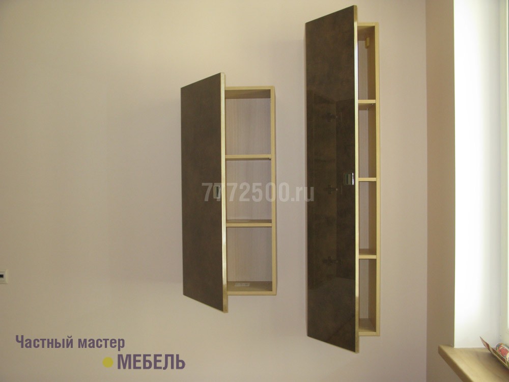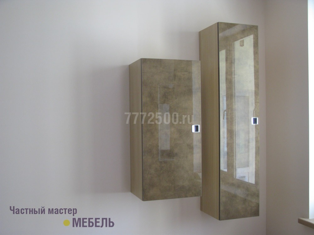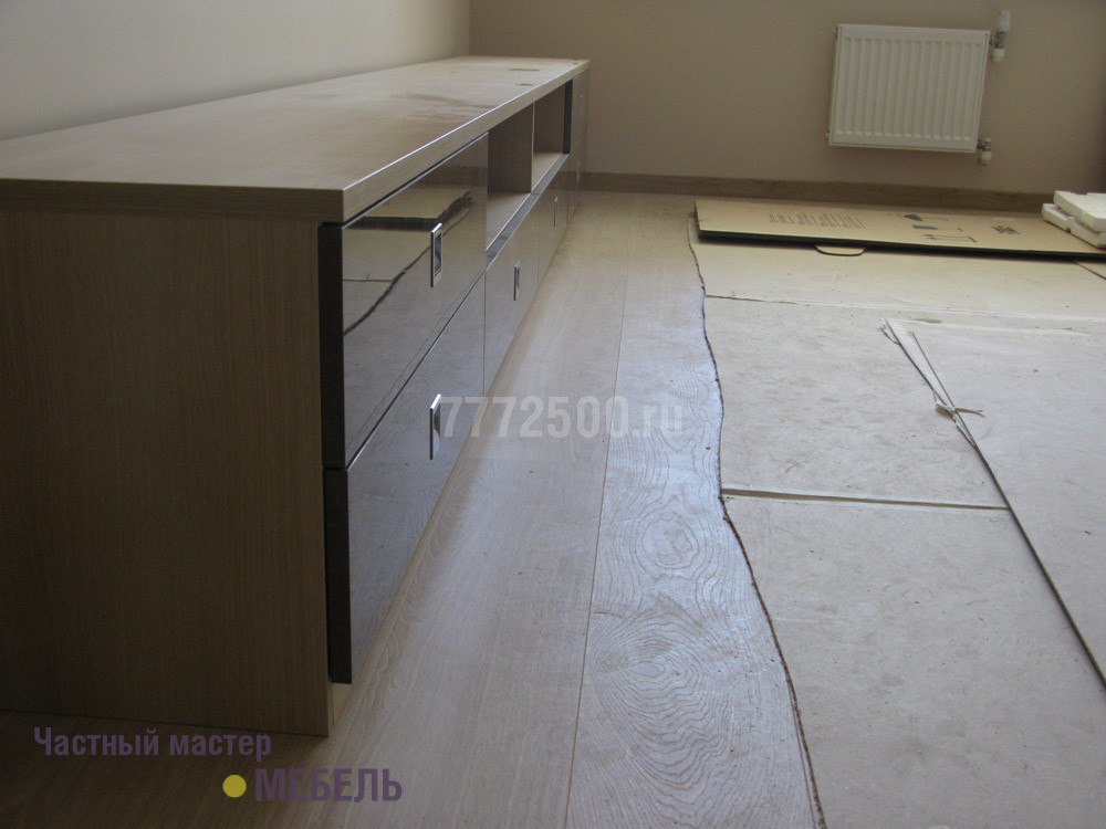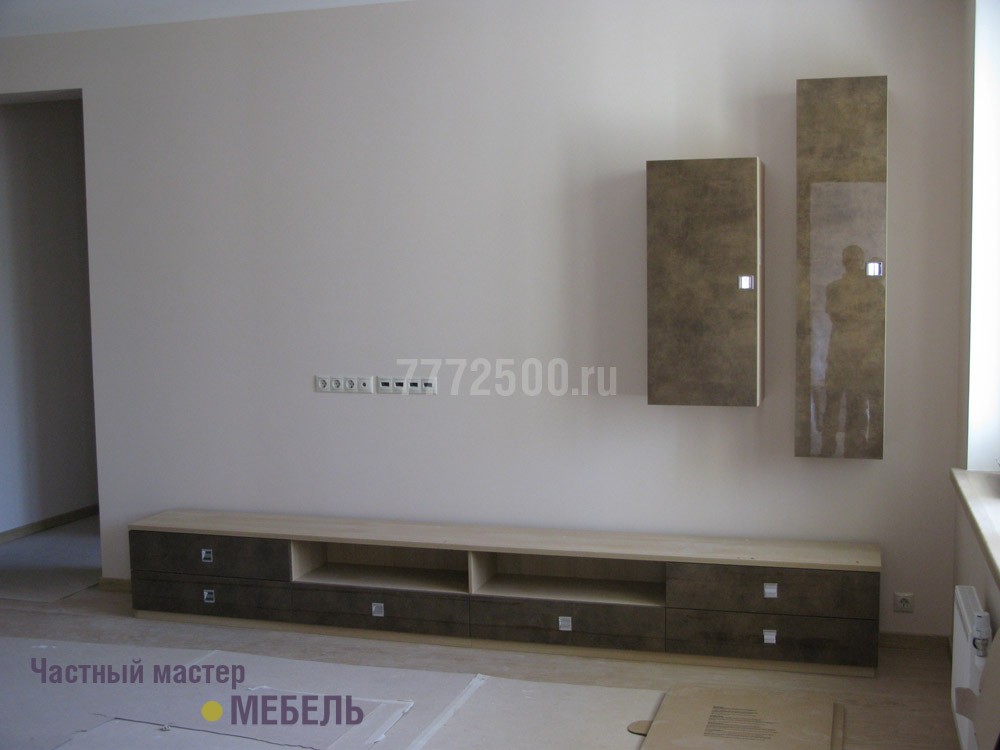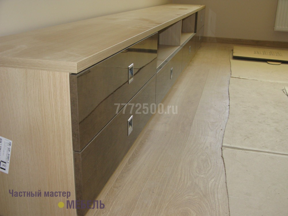 Тумба под телевизор с навесными шкафами из ЛДСП «Egger» цвета Дуб Феррара Светлый. Фасады из глянцевых панелей «Алвик». Ящики на скрытых направляющих с доводчиком, «Blum», Австрия.