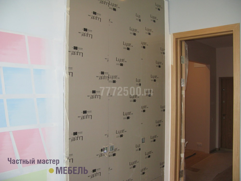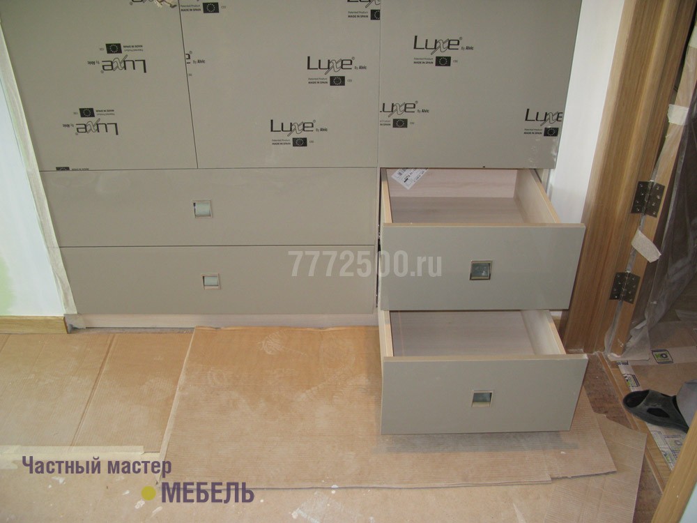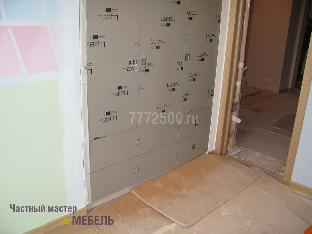 Шкаф для одежды из ЛДСП «Egger» цвета Акация Лейкленд. Фасады из глянцевых панелей «Алвик». На фото фасады в защитной пленке. Ящики на скрытых направляющих с доводчиком, «Blum», Австрия. Ручки врезные. Стояла задача сделать корпусный шкаф в нише с минимальными зазорами.