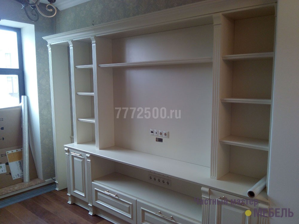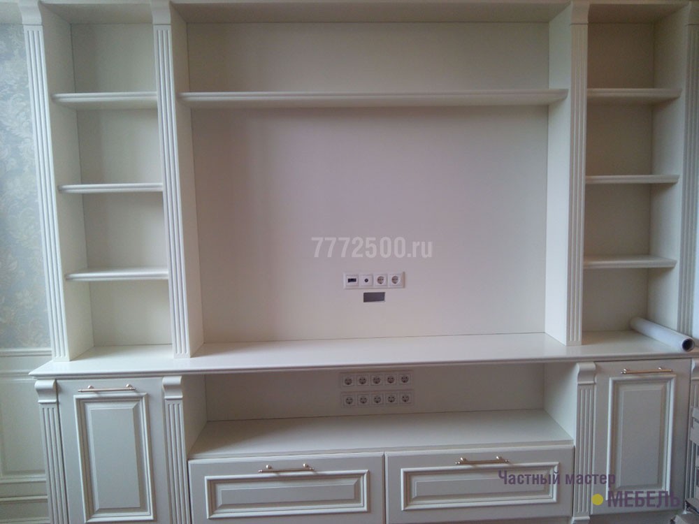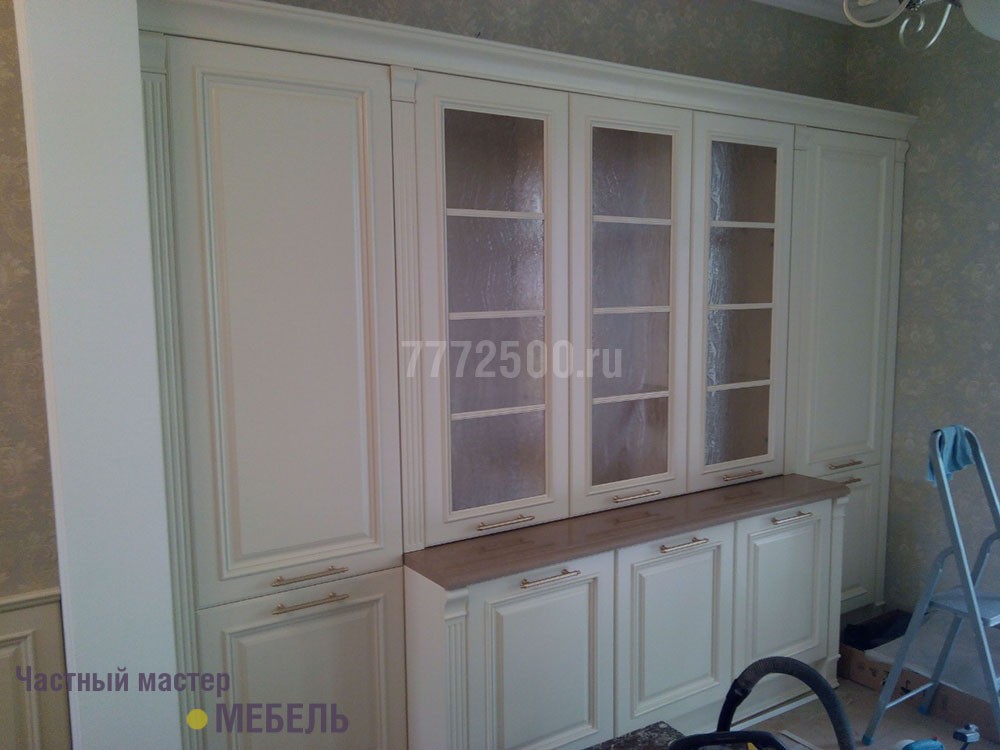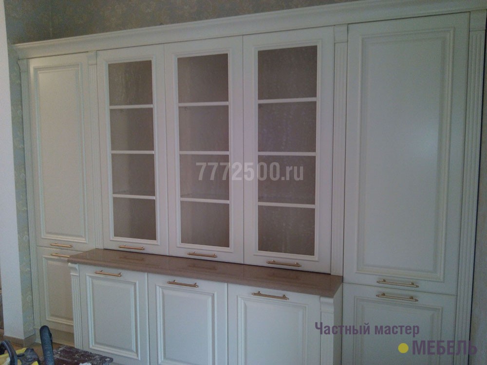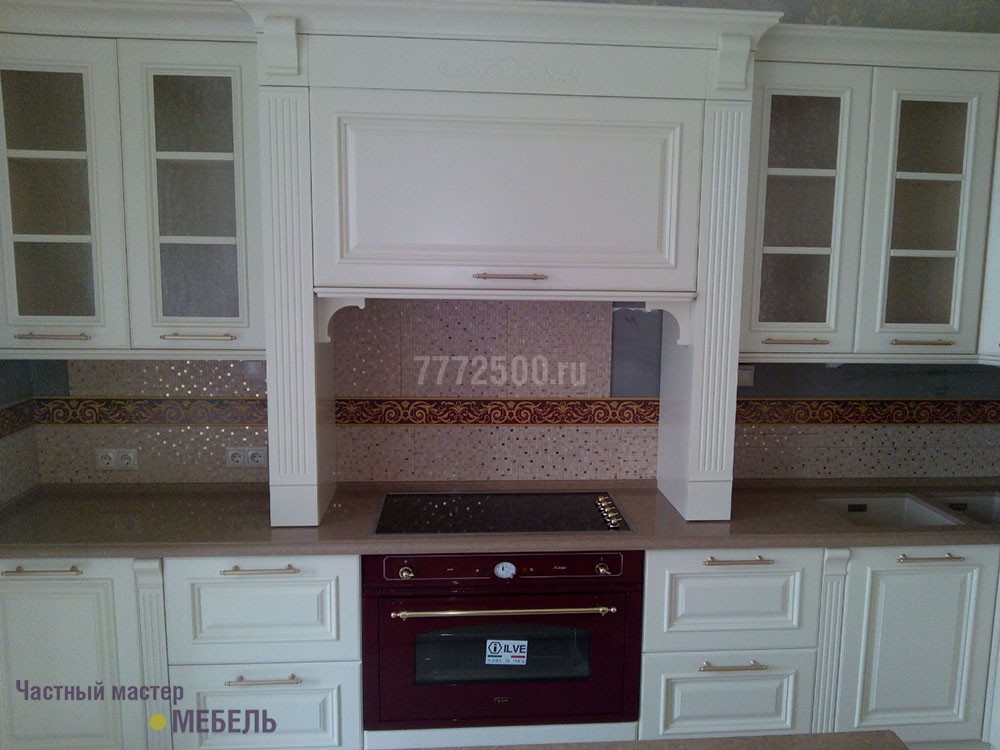 Вся мебель в этом заказе делалась из МДФ и покрывалась матовой эмалью. Вся фурнитура австрийской фирмы Blum. Фасады и декоративные элементы делались на заказ.