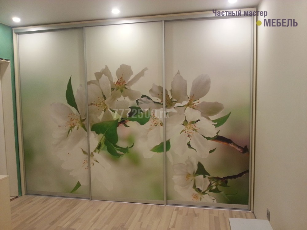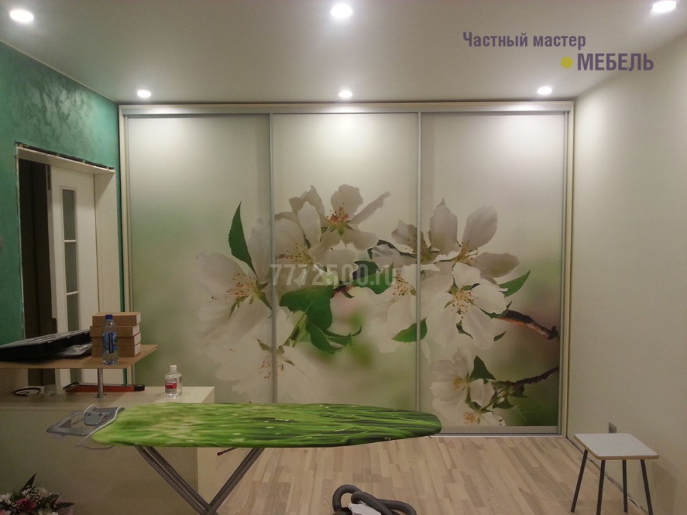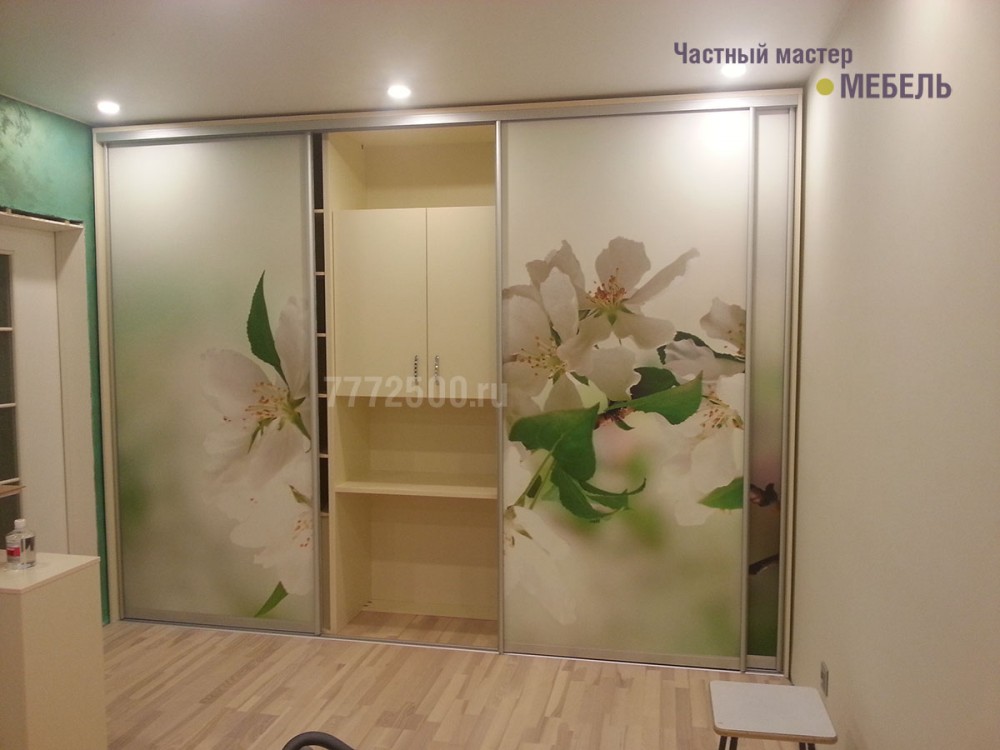 Двери из немецкого профиля «Raumplus» со вставками ЛДСП и нанесенной на них фотопечатью. Шкаф выполнен в цвете "Ваниль"